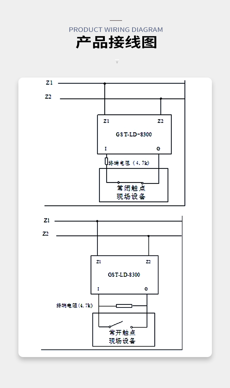 Z1、Z2:接火災(zāi)報(bào)警控制器信號(hào)二總線,無極性