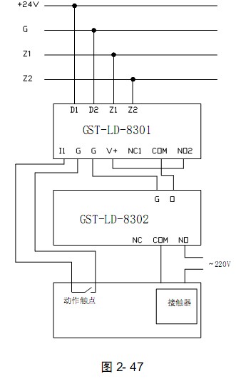 GST-LD-8302切換模塊與8301模塊配合使用控制交流設備的方法如圖2- 47 所示:
