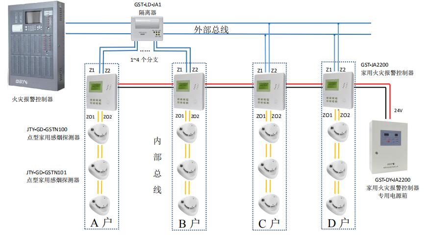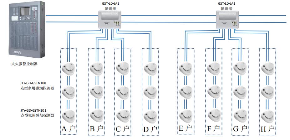 GST海灣家用火災(zāi)安全系統(tǒng) A 類設(shè)計(jì)中,隔離器為必選件,不占地址,將回路中家用探測(cè)器按規(guī)劃進(jìn)行地址分配。