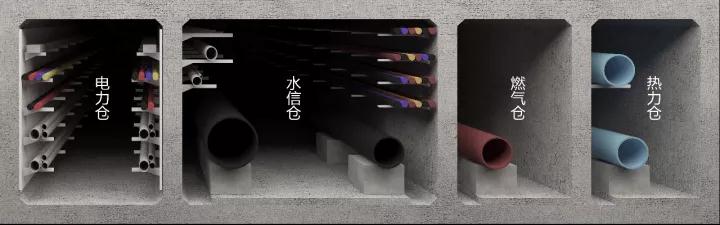 采用雙倉布置配套設施,城市電力管線、通信管線位于一個倉位,供水管道、中水管道、供熱管道位于一個倉位。