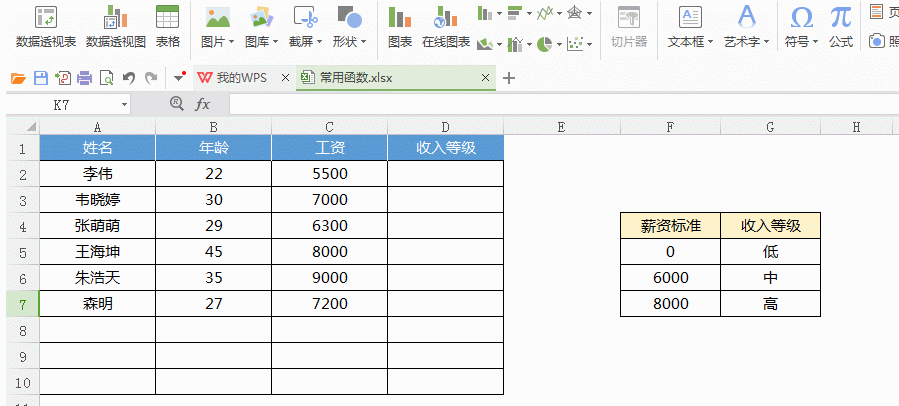 模糊查找:將員工收入劃分等級(jí),工資低于6000屬低收入,6000-8000中等收入,8000以上高收入。