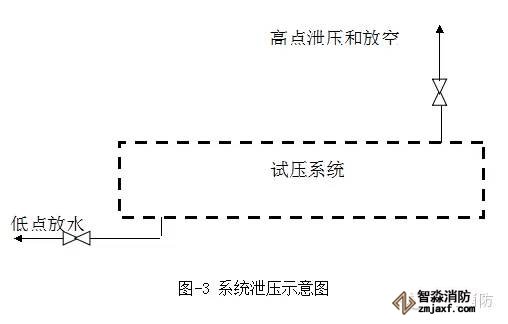 6.5.2管道系統試壓合格后進行泄壓排水時,必須先開啟管道系統高點的復位放空閥,在系統無壓力后,仍開高點放空閥,然后打開系統最低點的排水閥進行系統排水(見圖-3),將系統水排到指定地點。