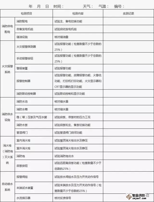 3、發現的問題或存在故障在“實測記錄”欄中填寫,并及時處置;當場不能處置的要填報《建筑消防設施故障處理記錄》。