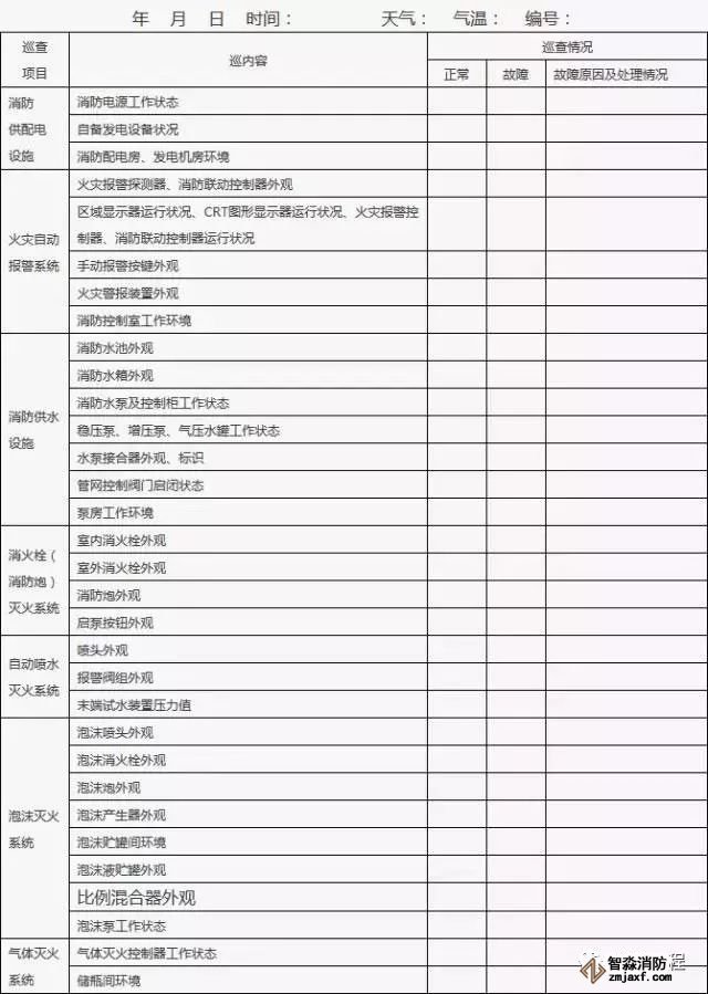 1、建筑消防設施巡查應明確各類建筑消防設施巡查部位,巡查應當每周至少一次,并填表。依法開展每月防火巡查的單位和設有電子巡查更系統的單位,應將建筑消防設施巡查部位納入其中。