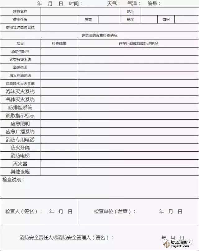 3、情況正常在“檢查結果”欄中標注“正常”;發現的問題或存在故障應在“存在問題或故障處理情況”欄中填寫,并及時處置;當場不能處置的要填報《建筑消防設施故障處理記錄》;其他需要說明的情況在“檢查說明”欄填寫。