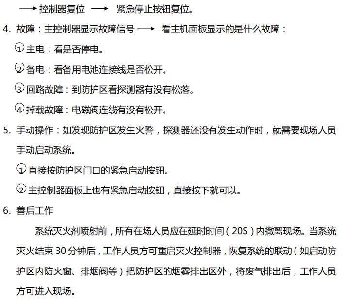 本系統在保護區內設置有氣體滅火控制器、煙感、溫感、聲光報警、警鈴、放氣指示燈、緊急啟動按鈕。當有火情時,煙感、溫感同時探測到火災信號反饋到氣體滅火控制器,警鈴和聲光器報警,保護區內人員開始疏散,系統延遲 20 秒后,滅火控制器啟動七氟丙烷滅火裝置,開始向保護區噴放滅火劑,同時保護區門口的放氣指示燈點亮,警告人員不得入內。如在火情時,報警系統出現故障,可通過保護區門口的緊急起停按鈕,手動按下進行人工放氣。如出現誤報警狀態,也可通過該按鈕,停止向保護區放氣。