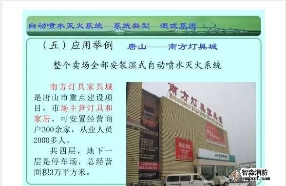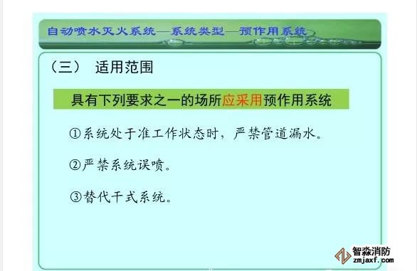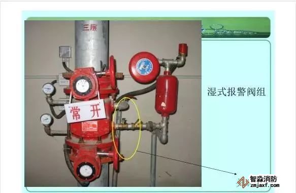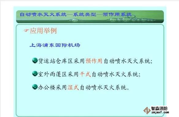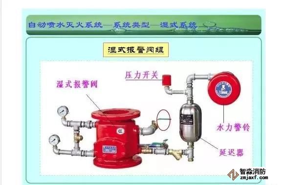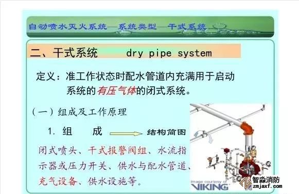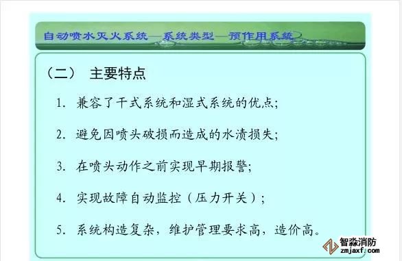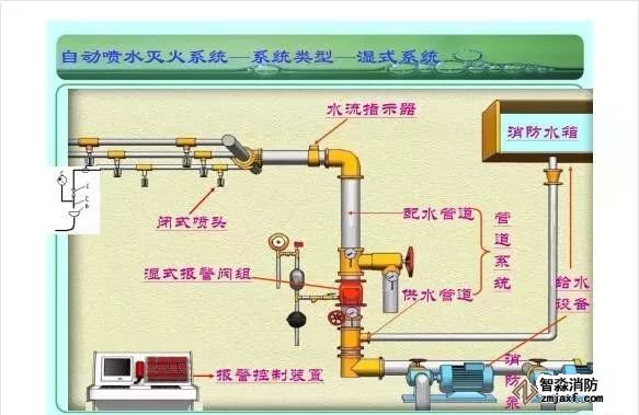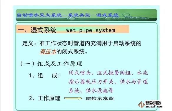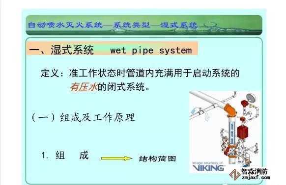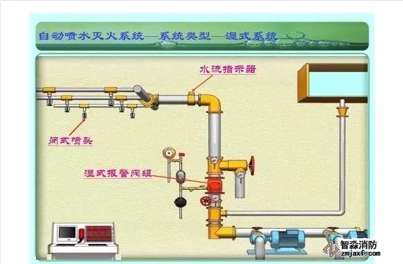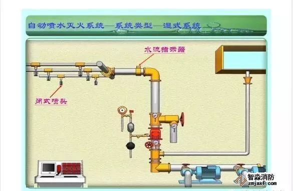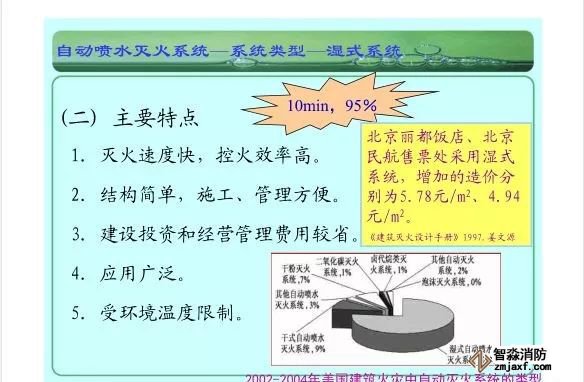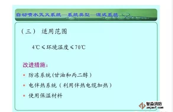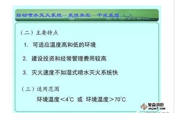 在環(huán)境溫度不低于4℃、不高于70℃的建筑物和場所(不能用水撲救的建筑物和場所除外)都可以采用濕式系統(tǒng)。該系統(tǒng)局部應(yīng)用時,適用于室內(nèi)較大凈空高度不超過8m、總建筑面積不超過1000㎡的民用建筑中的輕危險級或中危險級Ⅰ級需要局部保護的區(qū)域。3.濕式系統(tǒng)特點:①.結(jié)構(gòu)簡單,使用可靠②.系統(tǒng)施工簡單、靈活方便